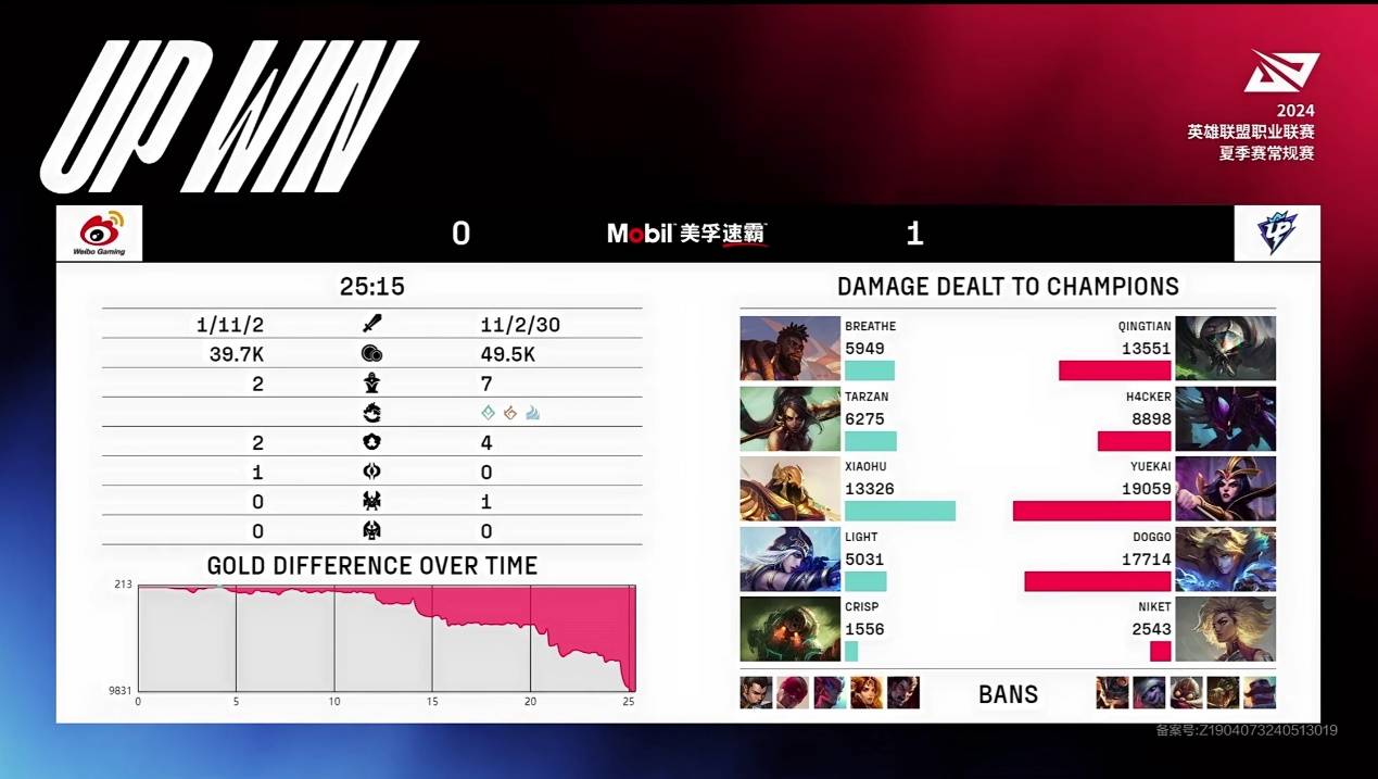 第一局比赛,UP仅仅用时25分钟就打出了11-1的人头比结束比赛,比赛中辅助Niket多次精彩开团立下大功。