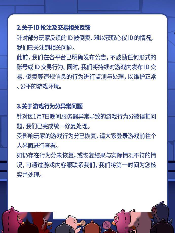 针对因 1 月 7 日晚间服务器异常导致的游戏行为分被误扣问题,我们已完成统一修复处理。受影响玩家的游戏行为分已恢复,请大家登录游戏前往个人界面进行查看。如仍存在行为分未恢复,或恢复结果与实际情况不符的情况,可通过游戏内客服联系我们,我们将第一时间为您核实并处理。