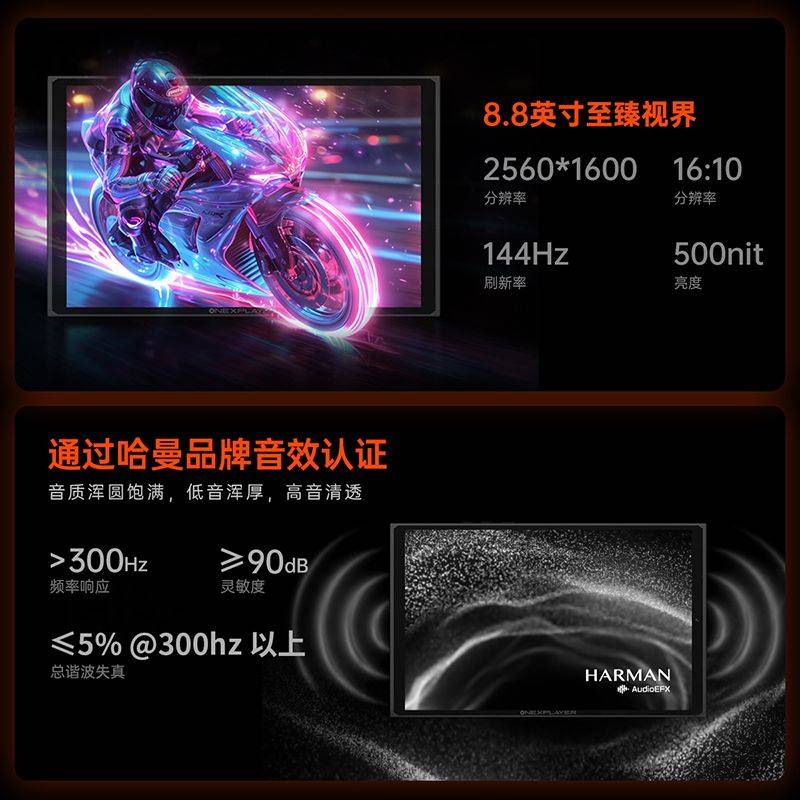 值得一提的是,壹号游侠X1 mini还配备了8.8英寸的高刷新率的电竞屏幕,支持144Hz高刷新率,分辨率2560*1600,且这块屏幕的色域容积达到了133% sRGB,DCI-P3色域98%,亮度500nits,无论是绚丽的游戏场景还是深邃的暗部细节,这块屏幕都能以惊艳的色彩表现和清晰度呈现,同时采用了哈曼金耳朵团队打造的通过哈曼品牌音效认证的双立体声2.0扬声器,让玩家享受沉浸式的视听游戏体验。同时,8.8英寸屏幕带来的小巧机身,仅约710g的主机重量,相较于传统笔记本电脑更加小巧轻便,方便用户随身携带。