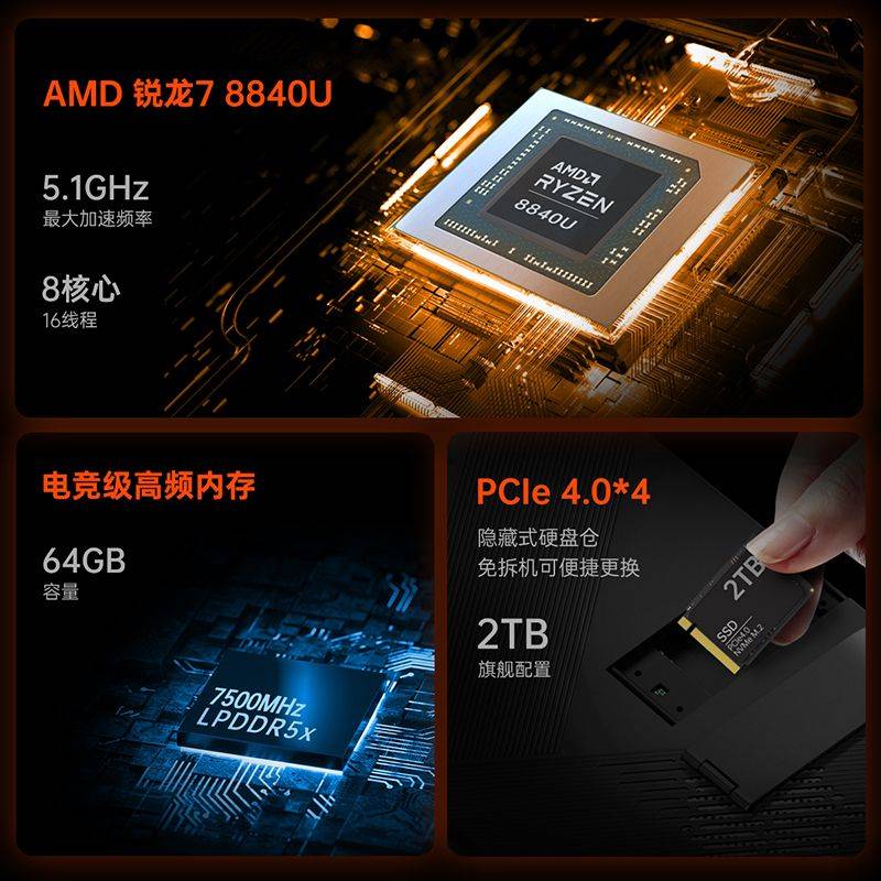 本次发布会的重头戏无疑是全新三合一PC——壹号游侠X1 mini,作为一款集合了mini笔记本电脑、平板电脑和PC游戏掌机三大形态于一体的创新产品,壹号游侠X1 mini在性能上表现颇为出色。它搭载了AMD锐龙7 8840U处理器,集成AMD Radeon 780M核显,这一高性能处理器能够为电脑提供强大的计算能力和快速的数据处理能力,无论是处理日常办公任务还是运行大型游戏,都能轻松应对。