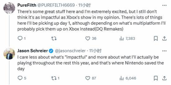不过也有玩家对此持相反的意见,表示:“本次的任天堂直面会确实很棒,我非常兴奋,但在我看来,我仍然不认为它像这次Xbox的发布会那样有影响力。”Jason再次回复:“我不太关心什么是“有影响力的”,我更关心我在今年剩下的时间里会玩什么游戏,这就是任天堂拯救世界的地方。”