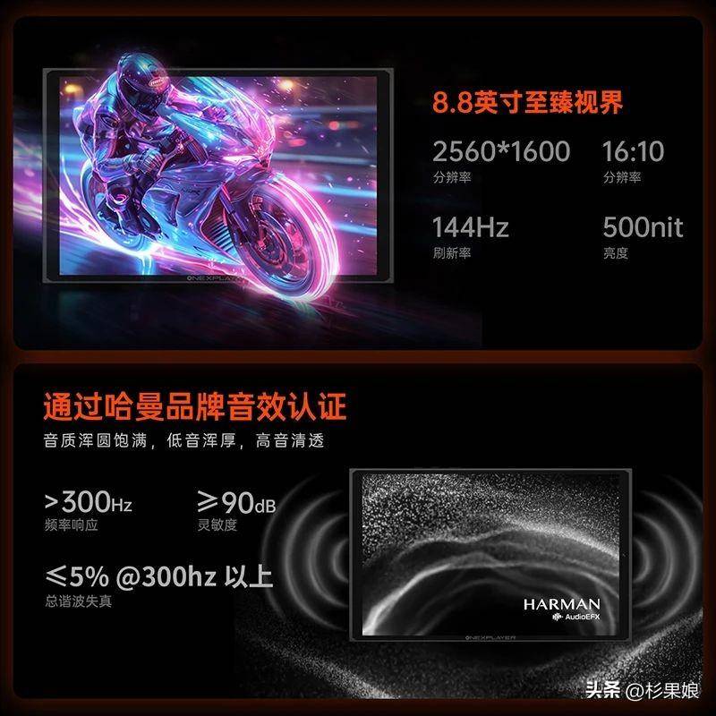 值得一提的是,壹号游侠X1 mini还配备了8.8英寸的高刷新率的电竞屏幕,支持144Hz高刷新率,分辨率2560*1600,且这块屏幕的色域容积达到了133% sRGB,DCI-P3色域98%,亮度500nits,无论是绚丽的游戏场景还是深邃的暗部细节,这块屏幕都能以惊艳的色彩表现和清晰度呈现,同时采用了哈曼金耳朵团队打造的通过哈曼品牌音效认证的双立体声2.0扬声器,让玩家享受沉浸式的视听游戏体验。