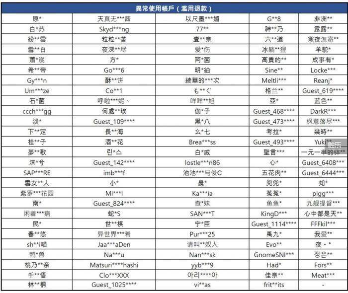 在封禁名单上的大部分是中国“大R”玩家,他们在游戏排行榜中位居前列,少则充值一两万,多则充值三四十万。然而,许多被封号的国内玩家表示,自己并没有申请过退款。这引起了一部分玩家的关注,毕竟没有游戏会如此唐突地对待“大R”玩家,除非事情真的十分严重。