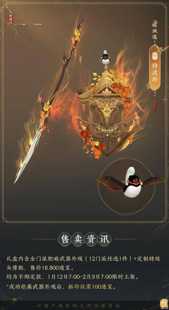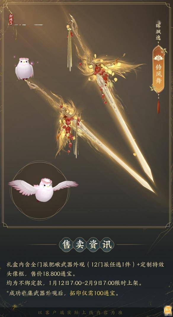 人歌小岁“啾”,花舞大唐春,全门派肥啾系列武器外观礼盒「群英论武·朝光」1月12日贺喜上新!礼盒内含「春晖飒逸」系列武器外观及定制特效头像框「像韵·辞花归秋」。
