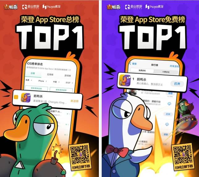 由虎牙和金山世游联合发行的社交推理手游《鹅鸭杀》自上线以来,迅速引爆全网。上线仅6日新增用户突破千万,同时最高在线人数(PCU)已超越Steam端历史峰值。累计斩获全网热搜近百个,并在多个主流平台登顶榜单TOP1。