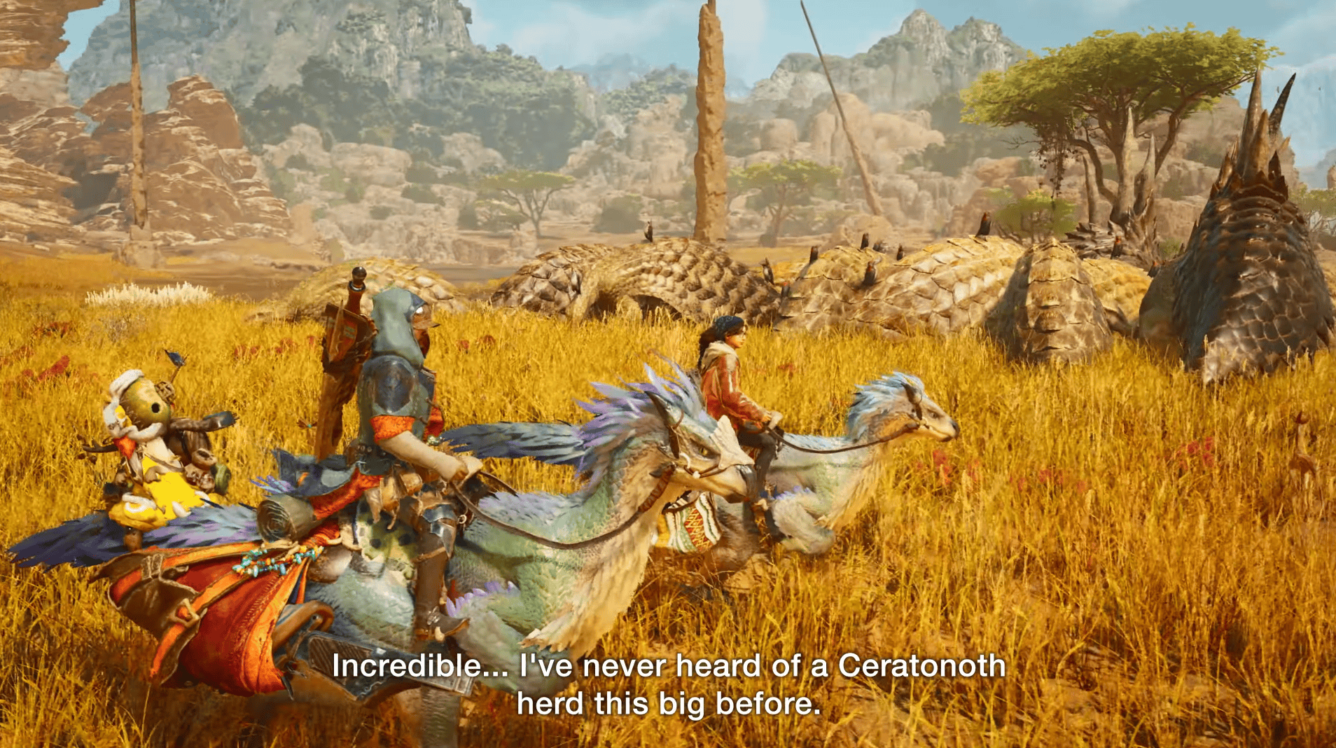 猎人主角还在村子里时,他骑上了鹭鹰龙,这是一种新的小型鸟龙种怪物。演示的工作人员提到,因为本作的地图是之前游戏的两倍大小,所以乘骑生物非常有用。考虑到《世界》里的地图之大,听起来《荒野》将非常大。