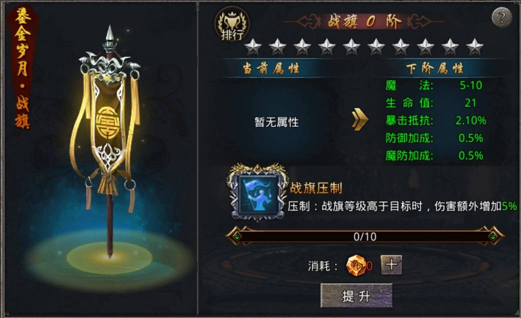 玩家可以通过消耗战意精石来提升战旗等级,每提升十颗星可以升一级阶。等级越高,战旗的压制效果更加明显。战意精石可以通过参加每天的跨服活动获得。