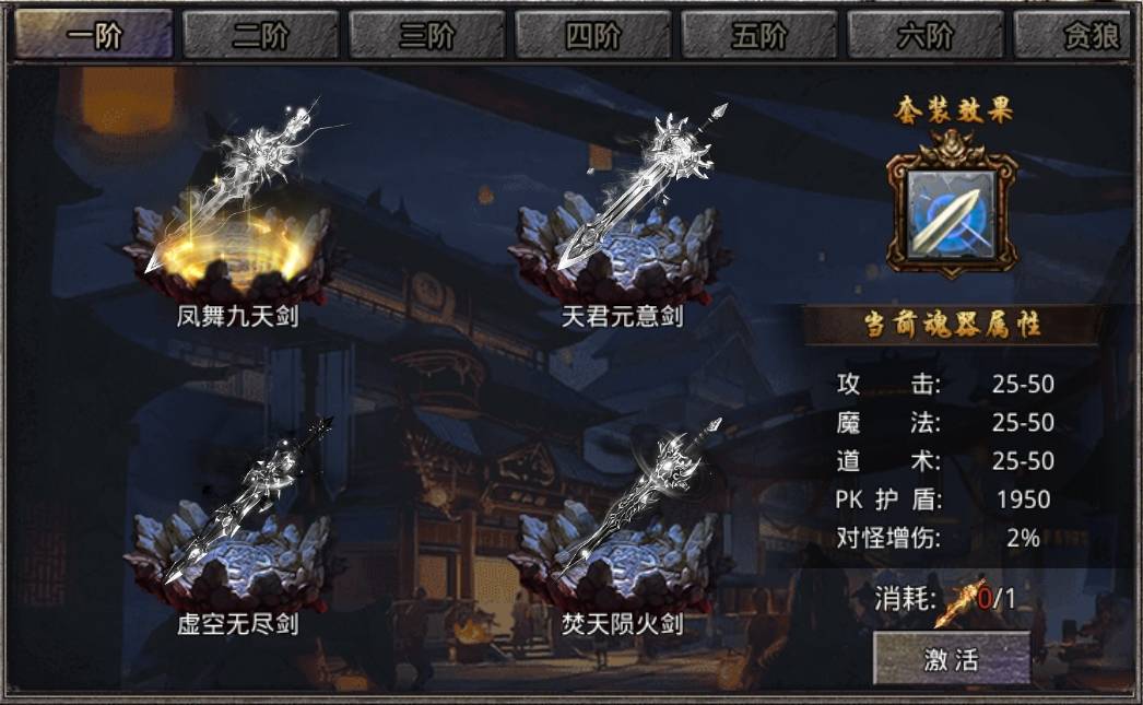 魂器共有六阶,不同阶级的魂器需要获取对应的道具激活,这些道具可以在魂殿掉落和拍卖行得到。激活魂器后,玩家可以获得对应的属性加成,包括攻击、魔法、道术、PK护盾、对怪增伤、防御、魔防和PK减免等。魂器的等级越高,提供的属性加成也越强大。