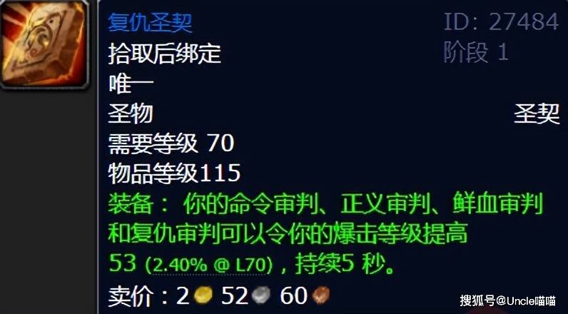 鲜血熔炉BOSS制造者掉落的复仇圣契,是惩戒骑大兄弟版本直接锁格子的超级圣物了,每天朝圣的黄静圣斗士惩戒骑犹如蝗虫过境一般疯狂,不过因为是英雄模式才掉,而且鲜血熔炉这个五人本真的小怪比BOSS都恐怖如斯,基本上组人要喊上大半天,所以最好还是能够自己人去,不然脸黑点天天喊人去刷的滋味可不好受!