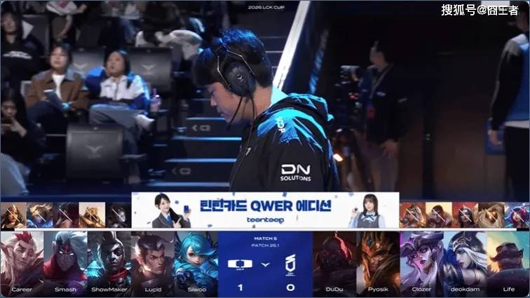第一局比赛,DK蓝色方,禁用:沙皇、发条、妮蔻、韦鲁斯、烬,选用:Swioo奎桑提、Lucid狼母、ShowMaker瑞兹、Smash芸阿娜、Career露露;DNS红色方,禁用:奇亚娜、杰斯、蛇女、皇子、泰坦,选用:Dudu兰博、Pyosik猴子、Clozer岩雀、deokdam飞机、Life娜美