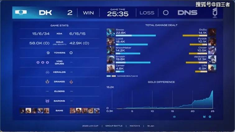 结果第二局比赛,依旧是DK顺风顺水,摧枯拉朽的碾压取胜。3分钟左右,洛拿下一血,后续韦鲁斯和皇子相继阵亡;9分钟左右,皇子来到下路击杀洛;11分钟左右,皇子来到下路击杀DK下路双人组;20分钟左右,DK中路发难击杀DNS下路双人组,随后皇子也被击杀;23分钟左右,两边中路混战,DK打出2换4;24分钟左右,DK拿下大龙;24分钟左右,DK中路发力击杀DNS中野,后续攻入高地打出0换3;最终25分36秒,DK团灭DNS后,顺利一波。