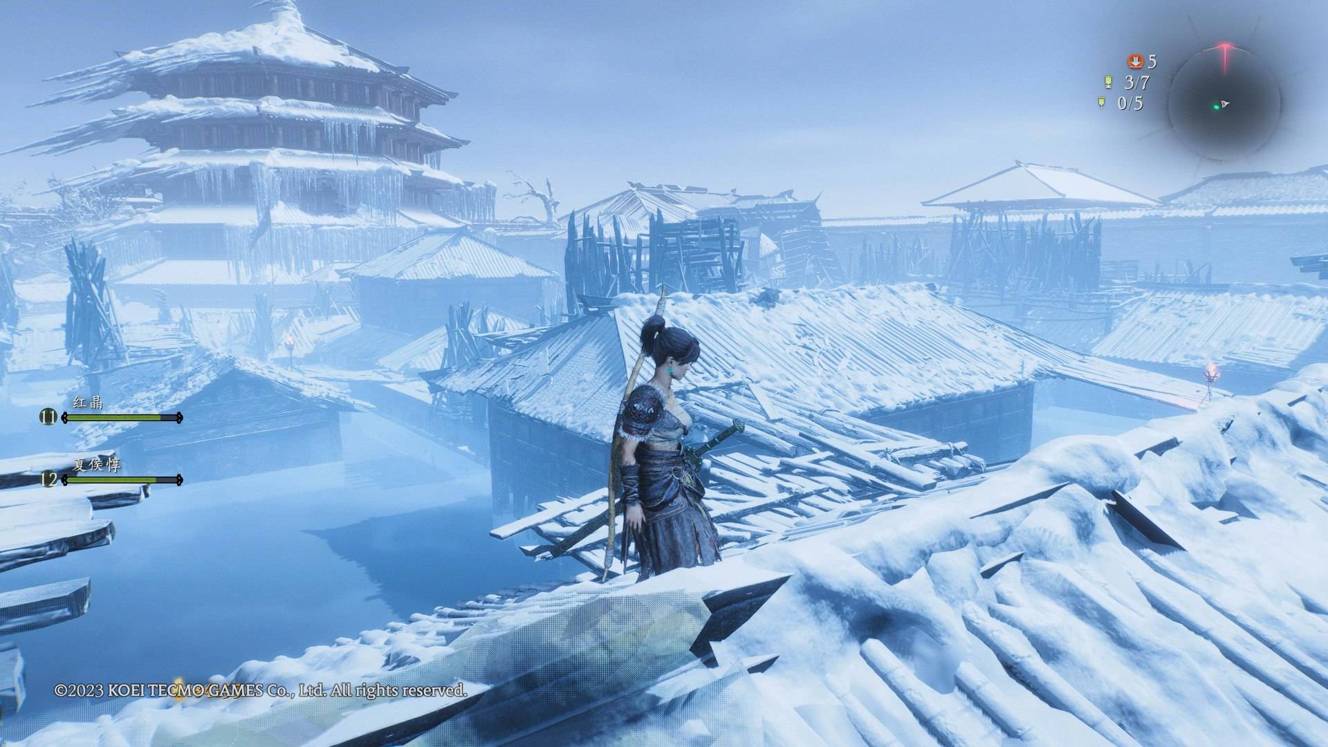 从运行表现来说,「卧龙」也算不上优秀,Team NINJA 把《仁王》那些糟粕画面设计搬到了「卧龙」中,游戏画面色彩饱和度之高对我的双眼造成了显著的伤害,尤其是某关的冰天雪地地图,白茫茫一片再开启 HDR,几乎分辨不出来地上闪烁的道具,仿佛真的得了雪盲症一般;部分关卡的地牢与闪着不详红光的藤蔓融合,对视觉的刺激远比《仁王》高。游戏的可视距离在评测版本中非常近,十几米外的敌人都会突然从画面中消失,要靠近一点才会显示出来,对于新世代主机来说,出现这种问题实属不该。