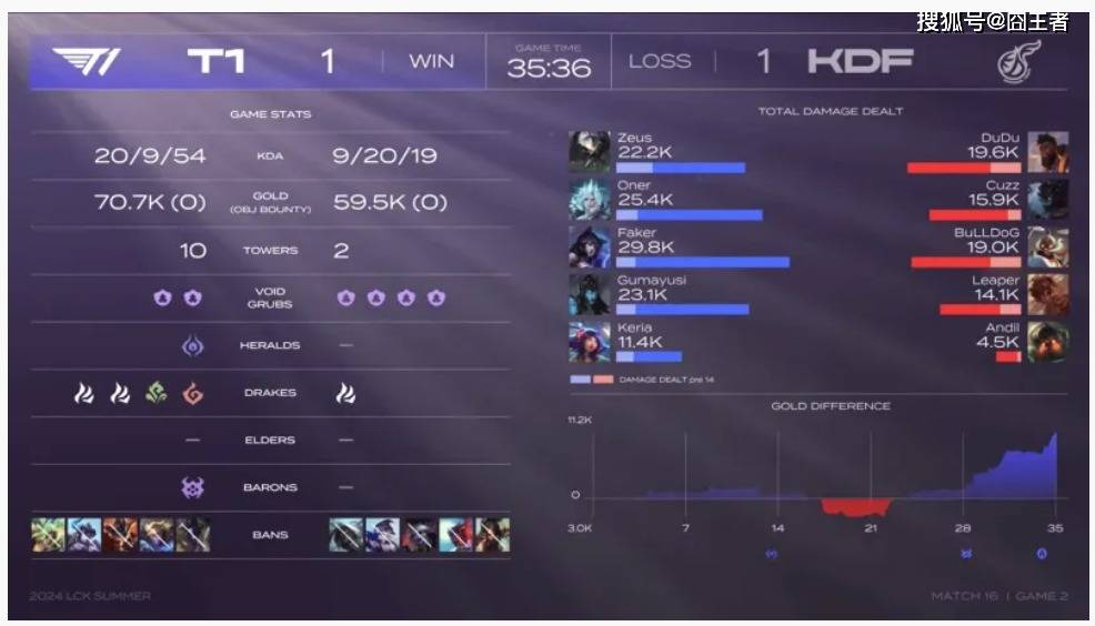 结果第一局比赛,纸面要远胜KDF的T1,在前30分钟就打出了近6000的经济优势。当绝大多数玩家以为T1会滚雪球获胜的时候。比赛在30分钟发生了惊天逆转,T1抓大树失败,蕾欧娜落单被抓后,KDF一波拿下大龙和火龙魂。至此,KDF不仅追回经济,还掌控了比赛节奏。最终36分18秒,剑魔TP到正面,帮助KDF完成惊天逆转。玩家们,也活久见的看到T1在领先五千多经济的时候,被弱旅翻盘!