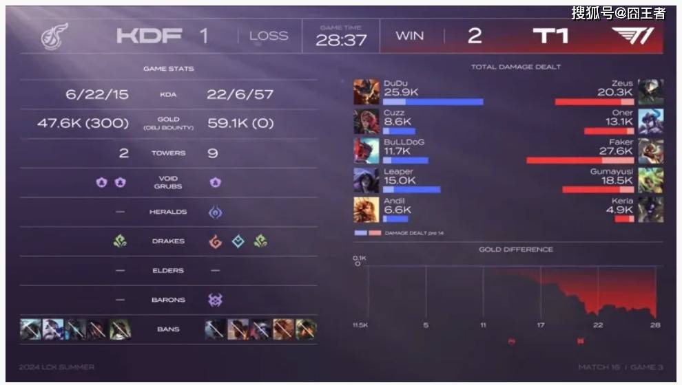 进入决胜局后,T1身为老牌豪门,选手比赛经验丰富的优势就显现无疑。他们从比赛一开始,就打出了节奏,12分钟左右,双方下路对拼,Faker飞机抓下,帮助T1一波打出0换3确立优势。天胡开局的T1得势后,疯狂大乱斗滚雪球,他们在30分钟的比赛里面,打出了22杠6杠57的KDA。这个数值,在LCK赛区里面,相当罕见。最终28分37秒,T1中路一波打出0换4后结束比赛。