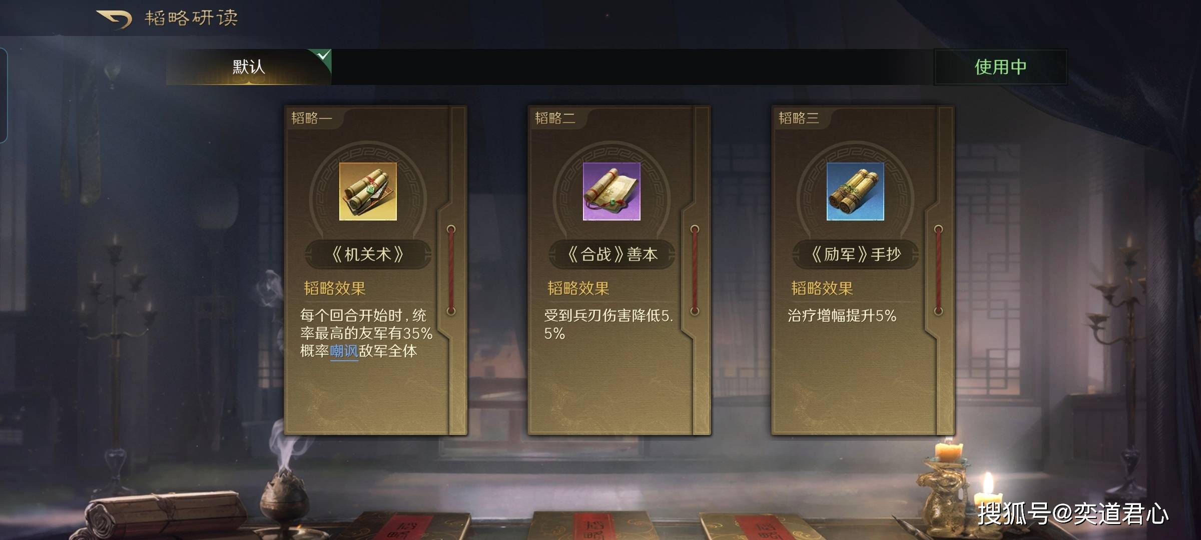 黄月英在木牛流马的基础上,第二战法被安排了指点乾坤,进一步提高队伍里武力最高和智力最高角色的攻击力,很明显是为了激发赵云和徐庶。第三战法运筹帷幄,全面削弱对手的武力、智力、统率和先攻。三本韬略依次是机关术、合战善本和励军手抄,足见这支队伍里赵云是被黄月英寄予厚望的,对面的仇恨都让赵云给拉走了。