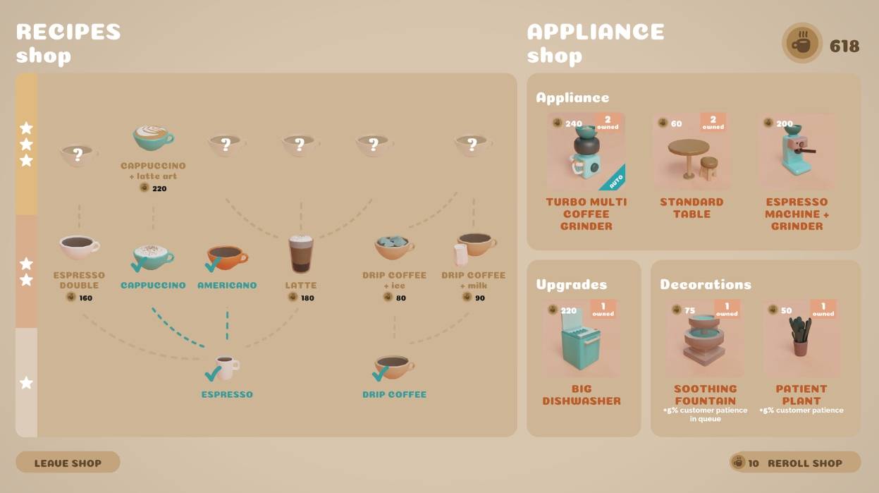 游戏中当前提供了数十种咖啡种类,玩家通过完成关卡获取金币,金币可以在路线商店中购买电器或升级,当然也能解锁食谱。解锁的食谱,可以在下一次关卡中作为营业项目,不同咖啡需要不同的电器搭配制作。以上游戏内容是自洽且能够循环的,因此体验起来会很舒服。