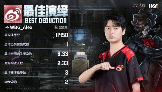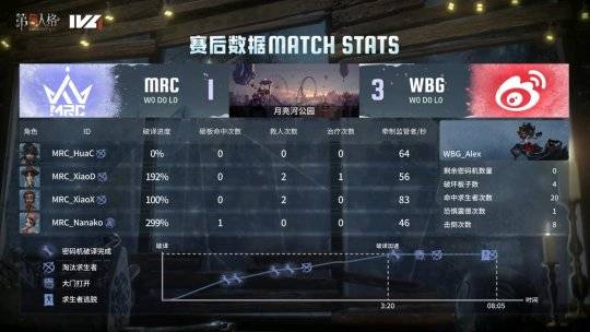 MRC的求生者选择了佣兵、冒险家、空军、杂技演员(BAN歌剧演员、时空之影);WBG的监管者Alex选择了“使徒”。(BAN先知、杂技演员、舞女、病患)