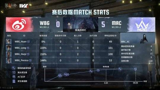 WBG的求生者选择了园丁、入殓师、调香师、野人(BAN时空之影);MRC的监管者XC选择了“使徒”。(BAN先知、杂技演员、佣兵、病患)