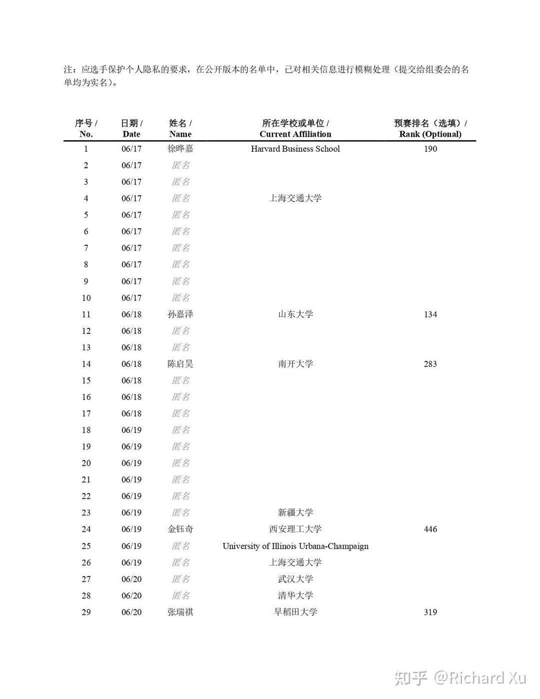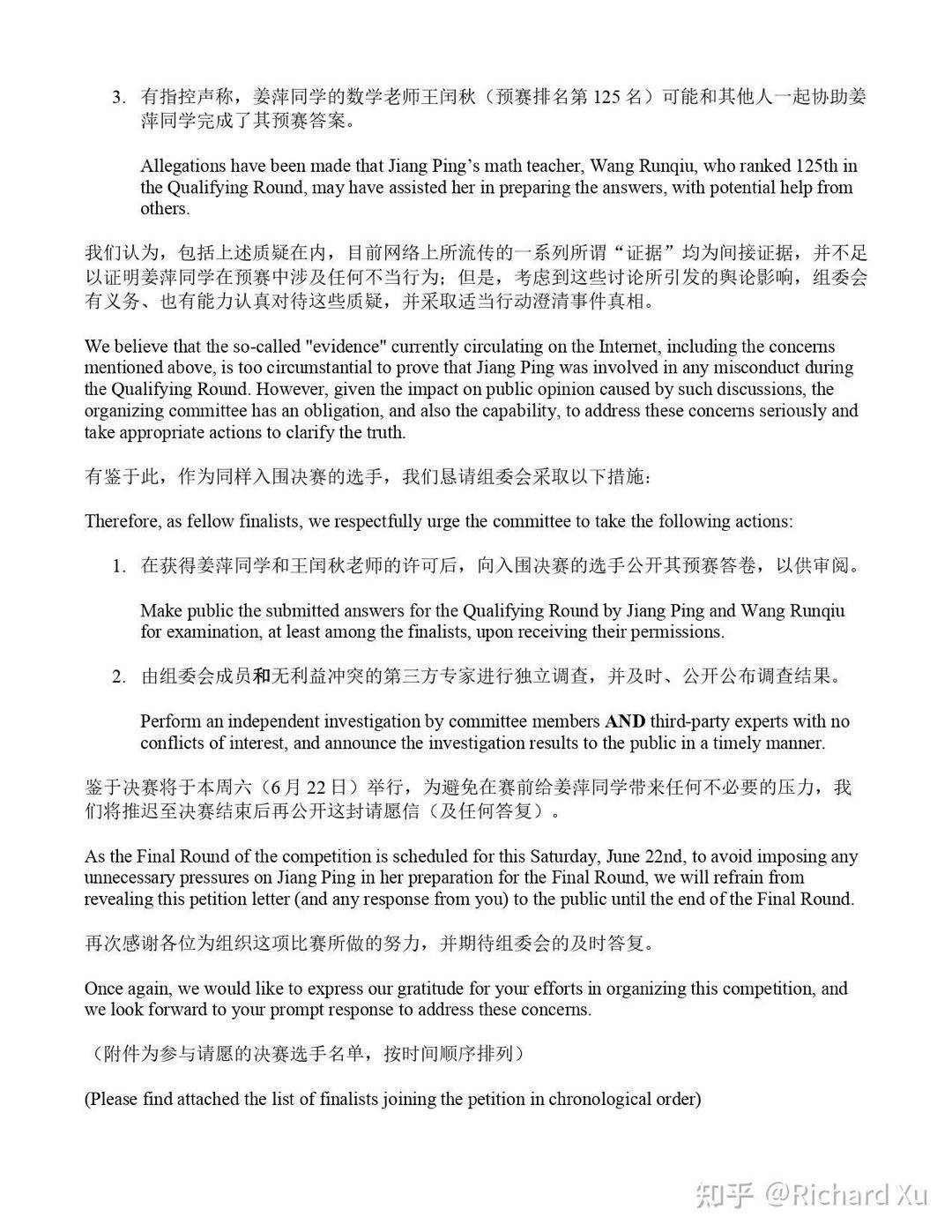 2024年6月23日,预赛第190名、入围名单上学校为“University of Southern California”(南加利福尼亚大学、南加州大学)的决赛选手徐晔嘉(Richard Xu,请愿名单中的“所在学校或单位”填写为“Harvard Business School”(哈佛商学院))发布消息,已于2024年6月19日下午1点,联合38名决赛选手(共39名)实名请愿,要求组委会就「姜萍事件」展开第三方独立调查,要求组委会采取以下措施: