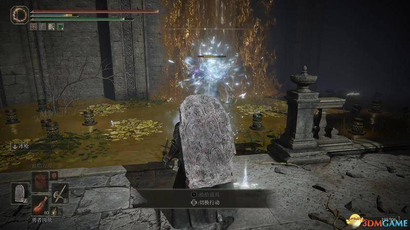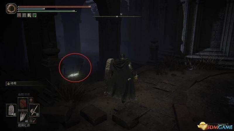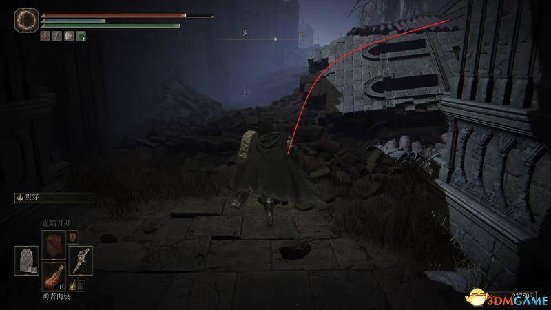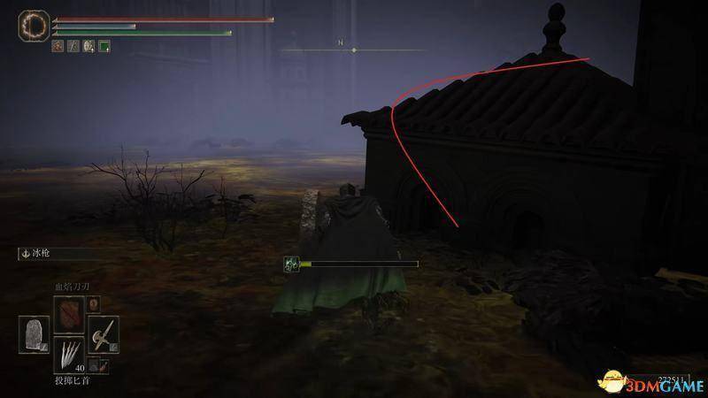 回到毒沼后沿着来路(也就是贴着左边走)走到有建筑残骸的地方。