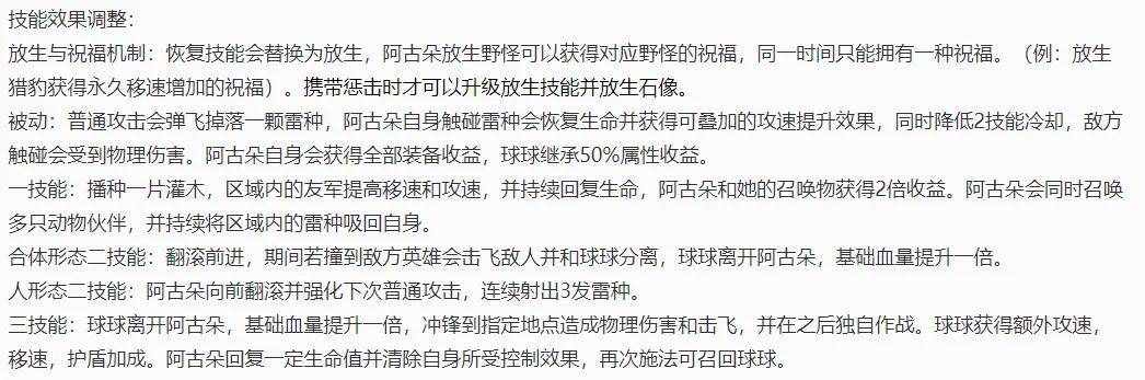 第三个,二技能移除了蓄力翻滚的机制,改为了固定距离和移速的翻滚,期间,如果撞击到英雄单位的话,不仅能造成击飞,还会让球球和阿古朵分离,相当于多了一个释放球球的渠道。