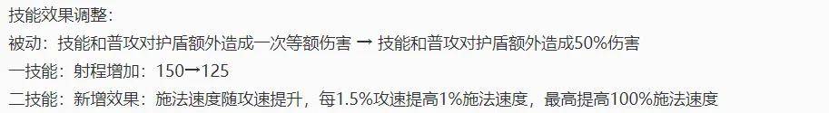 第二个,被动的破盾增伤,从原来的100%降低至50%,换句话说,以后伽罗对护盾型英雄的克制作用,就没有那么明显了,此外,一技能的射程也从150减少至125。