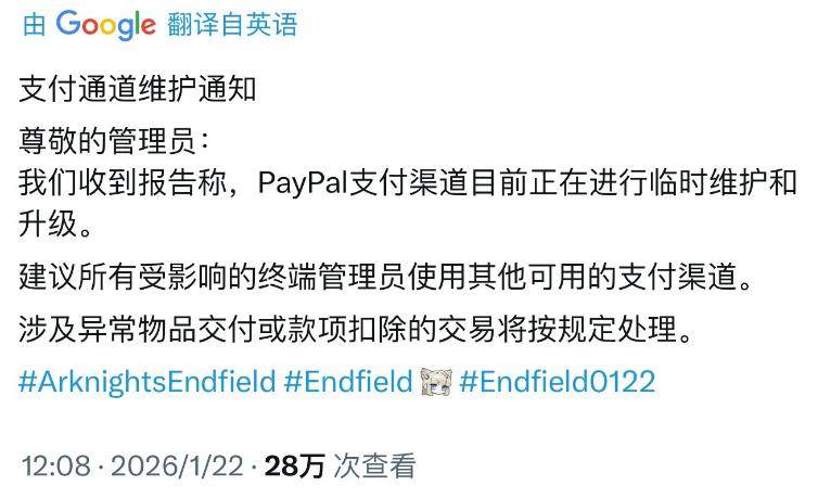 目前,鹰角已经紧急下线 PayPal 支付通道,暂停相关支付功能,并在社交媒体平台发布公告,承诺排查修复、处理退款与赔偿,但未公布具体方案与时间表。