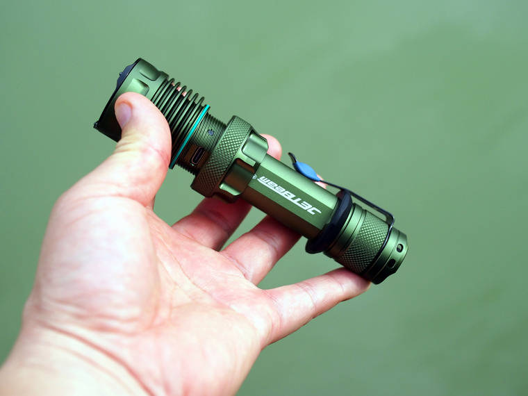 JETBEAM杰特明M37 PRO战术手电是一款尾部开关、配置隐藏式TYPE-C直充功能的手电筒。有军绿和军灰两款,我手里这款是军绿。M37 PRO由单节51mAh动力21700电池驱动,配置1颗CREEXHP50.3 HI LED灯珠,色温5000K.它采用航空级铝合金结构体,三级硬质微弧氧化处理。光通量覆盖30-3700流明。M37 PRO头部直径:38.5mm,尾部直径:27.5mm,长度147.8mm,重量:137.5g(不含电池)。M37 PRO采用新一代IC数字恒流电路设计,战术开关,一触即亮,IPX8防水和1.5米防跌落结构,攻击头顶端配有三颗超高硬度氧化锆陶瓷珠,助于逃生破窗功能,是一款专为军警、执法、探险及户外所设计的便携战术手电。