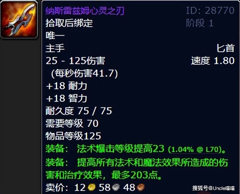 卡拉赞作为小团本,基于人数的问题,最容易引发狂热的武器,喵叔给到法系DPS前期极品的王子匕首,这玩意甚至有大兄弟豪言壮志用到了太阳井高地,喵叔不禁感叹这是天选排骨人啊!