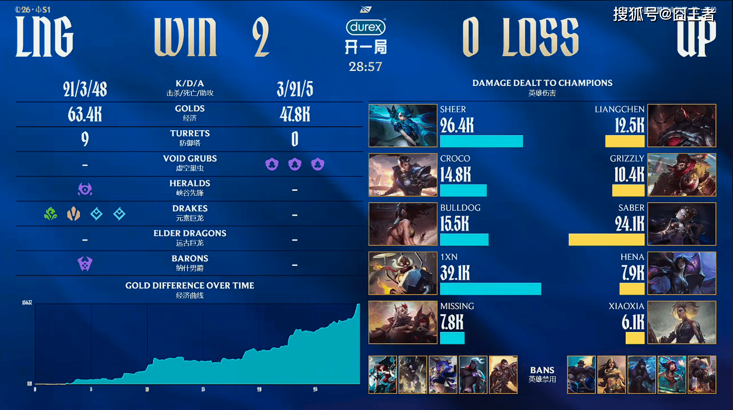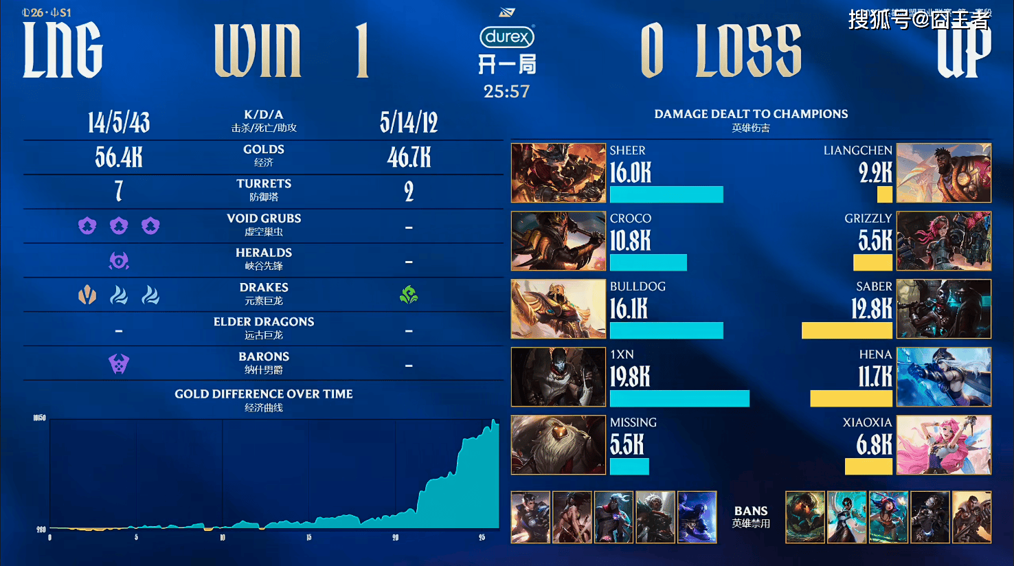 第一局比赛,LNG蓝色方,禁用:瑞兹、狼母、韦鲁斯、阿卡丽、赵信,选用:sheer兰博、Croco皇子、Bulldog沙皇、1xn烬、Missing巴德;UP红色方,禁用:杰斯、发条、妮蔻、泰坦、扇子妈,选用:Liangchen奎桑提、Grizzly蔚、Saber艾克、Hena寒冰、Xiaoxia女明星