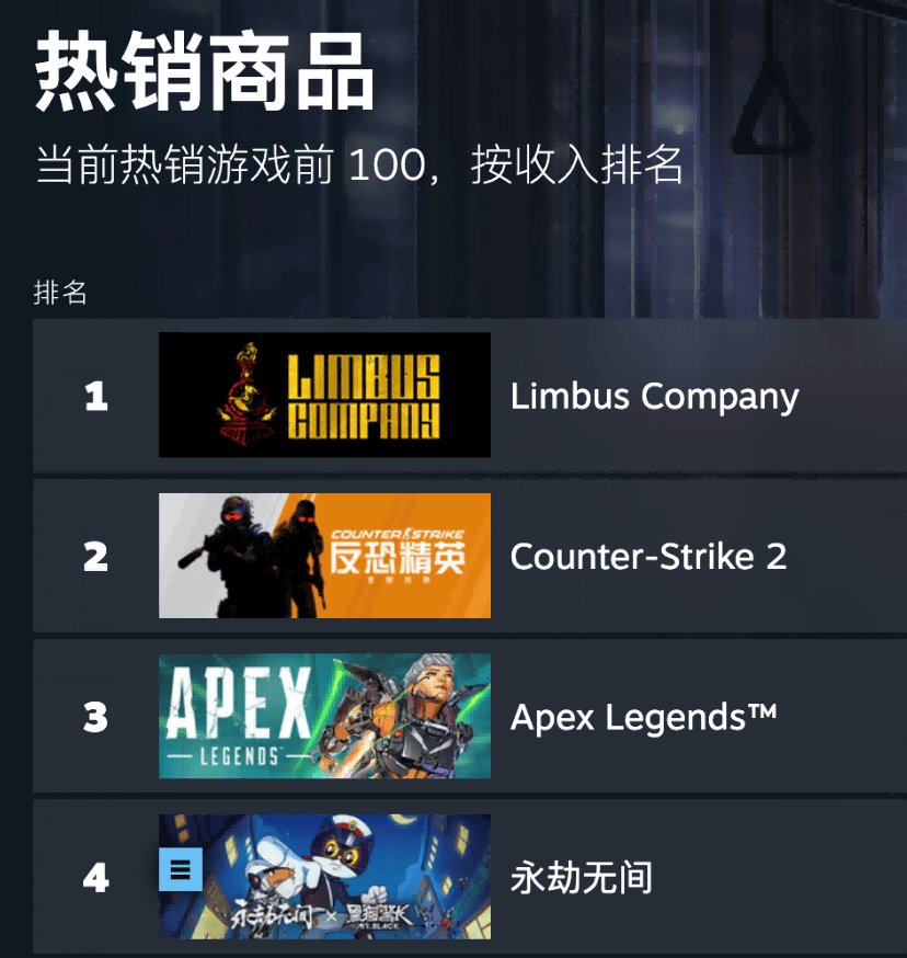 一款韩国游戏《边狱公司》(Limbus Company)力压《CS2》《APEX》《永劫无间》,一直从28位冲到了榜首。