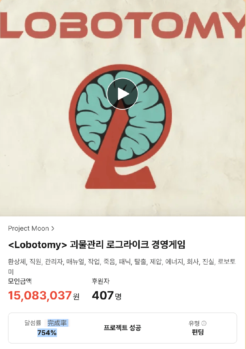 2015年8月,Project Moon的首个游戏《脑叶公司》上线韩国众筹平台Tumblbug。目标金额200万韩元,大概1.1万人民币。