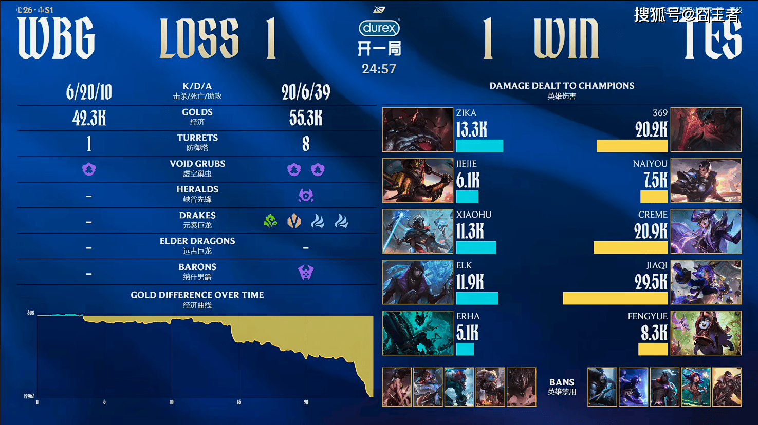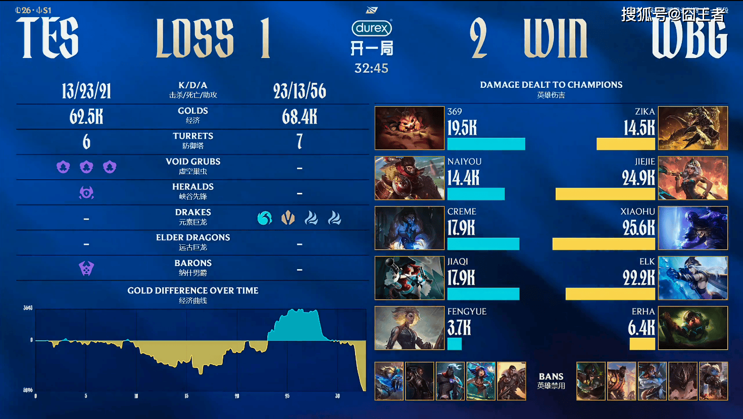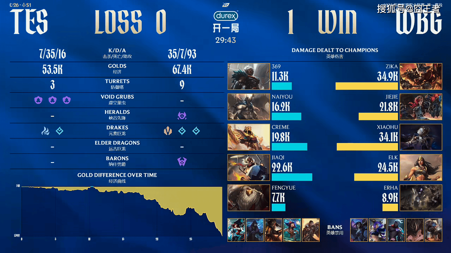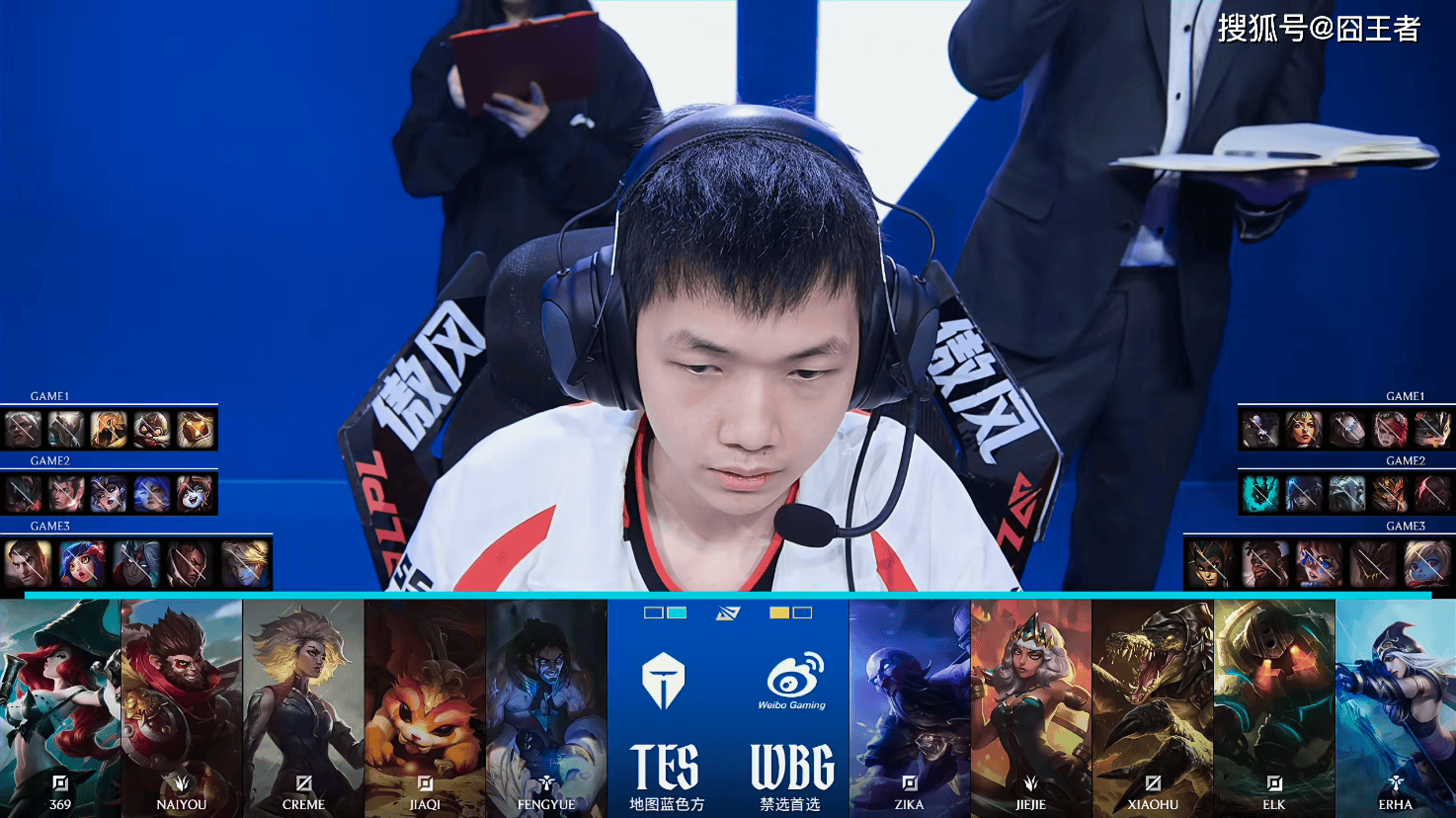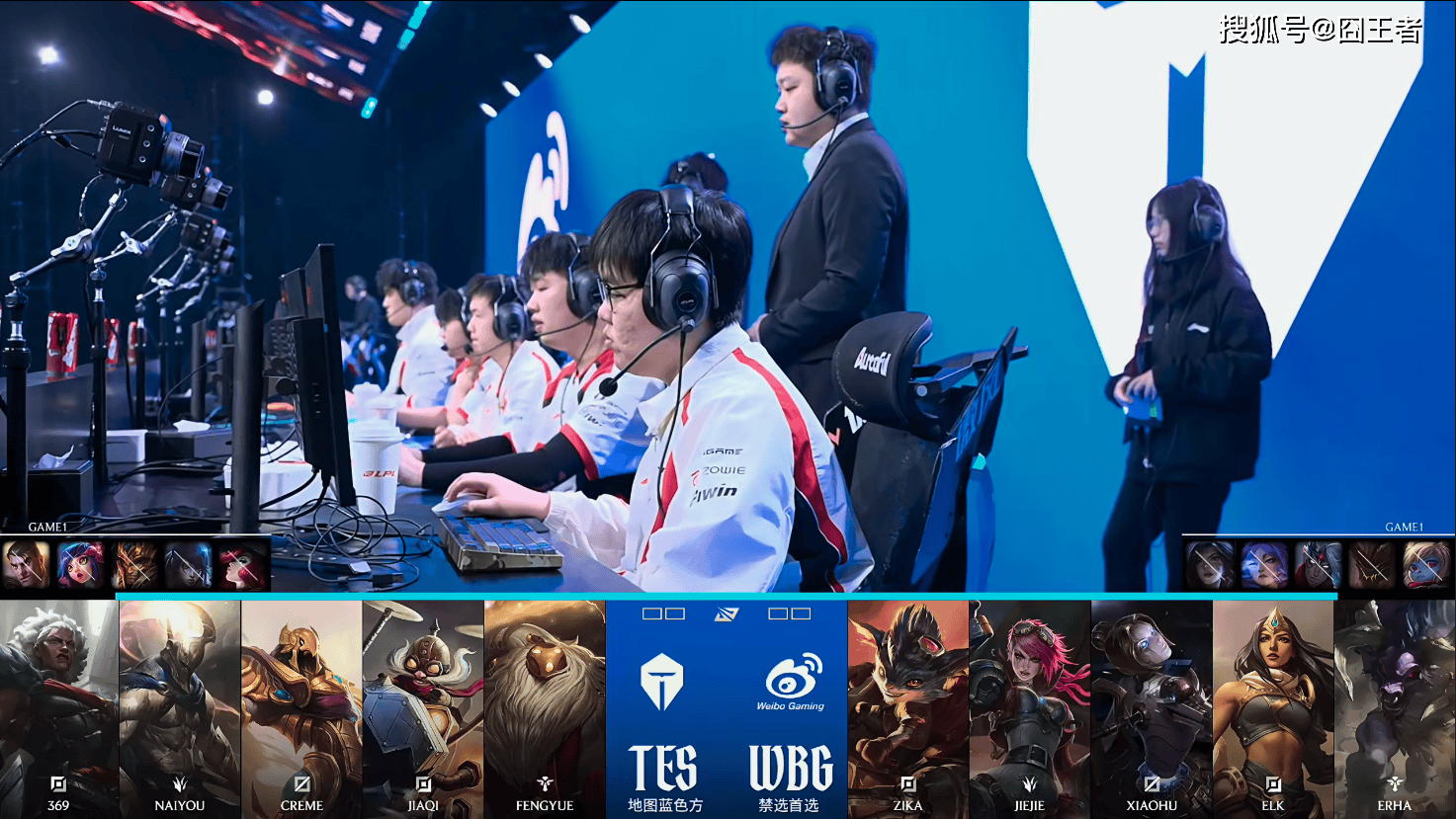 第一局比赛,TES蓝色方,禁用:杰斯,妮蔻,皇子,厄斐琉斯,女枪,选用:369狼母,Naiyou潘森,Creme沙皇,JiaQi飞机,fengyue巴德;WBG红色方,禁用:波比,石头人,韦鲁斯,芸阿娜,卡莎,选用:Zika兰博,Jiejie蔚,Xiaohu发条,Elk希维尔,Erha牛头