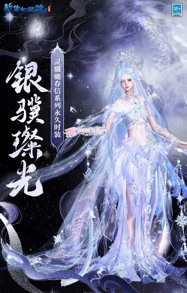 首先,这次主打的两套时装,风格截然不同,可以满足不同玩家的核心需求。【银骥照夜】系列,走的是经典武侠浪漫风。男款采用银白色锦缎,远看飒爽,近看才能发现衣料上用银线绣出的细致星河暗纹,低调里透着贵气。女款则是突出高腰和广袖的剪裁,不仅优化身材比例,行动时裙裾自然的渐变流动效果,让飘逸感浑然天成,没有刻意浮夸的光效,却显得格外高级。
