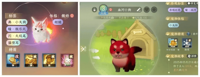 血河小狗,原本只是《逆水寒》手游内“育宠玩法”的随机性产物,有玩家尝试将带有特殊瞳色的小白狗跟一只普通的炽焰红色小狗一起繁育,结果繁育出了一直带有火焰尾特效、浑身通红、天生斜视的全新小狗。因为它“桀骜不驯”又“充满智慧”的眼神,跟游戏中血河职业的气质高度契合,因此被玩家们戏称为“血河小狗”,拥有了自己的专属代号。