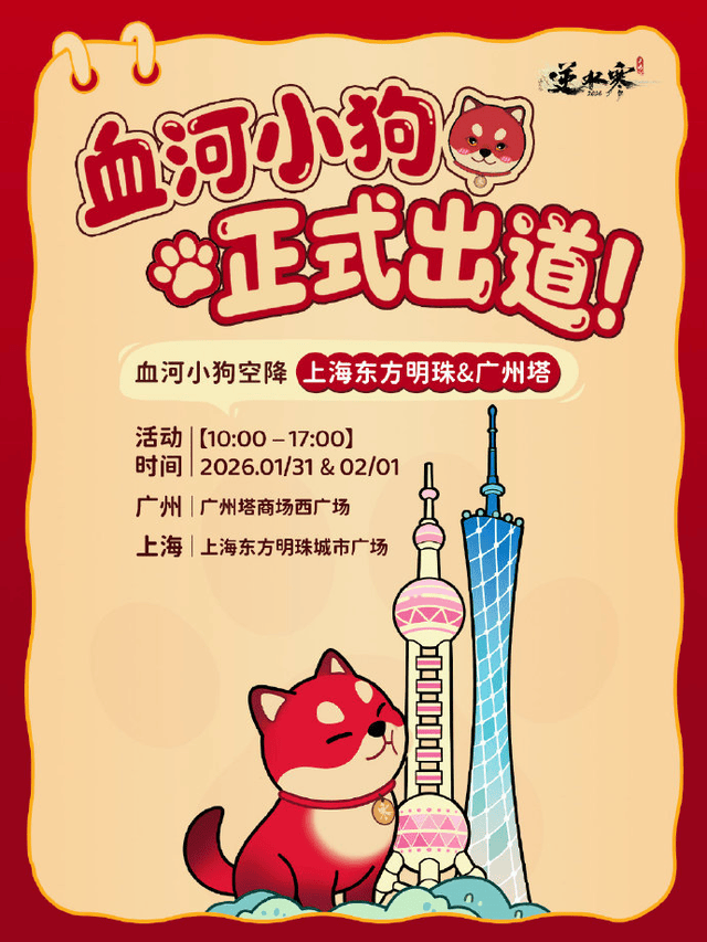 更夸张的是,1月31号到2月1号,血河小狗还会在上海东方明珠跟广州塔两个地表城市,同步放大招,高达5米的血河小狗气模直接空降,现场不仅有超多COSER互动,还有打卡福利活动,发打卡内容就能领周边,创作者更是有专属福利可以获取,让数以亿计的《逆水寒》手游玩家见识见识什么叫做顶流出道日!