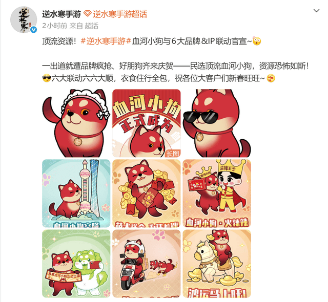 作为《逆水寒》手游的官方吉祥物,血河小狗一口气联动了潮宏基、麻辣王子、白菜狗还有爱玛电动车四个国民IP,推出了真金金片、联动礼盒等惊喜,可以说衣食住行全包了。
