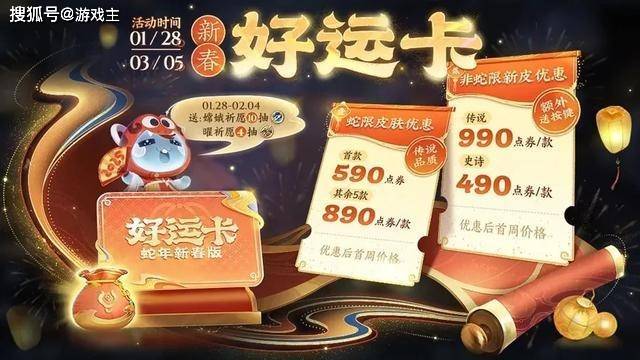 去年的好运卡是180点券,购买后再入手首款蛇年限定,仅需590点券,其余5款则都是890点券,同时,还会赠送曜无双限定的4抽+嫦娥珍品传说的10抽。