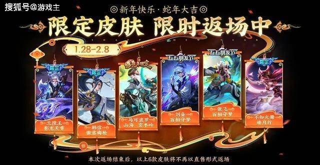 还有返场皮肤,去年是傲雪梅枪+玄木吟+刘备百相守梦+绯月行+影龙天宵+张飞百相守梦。