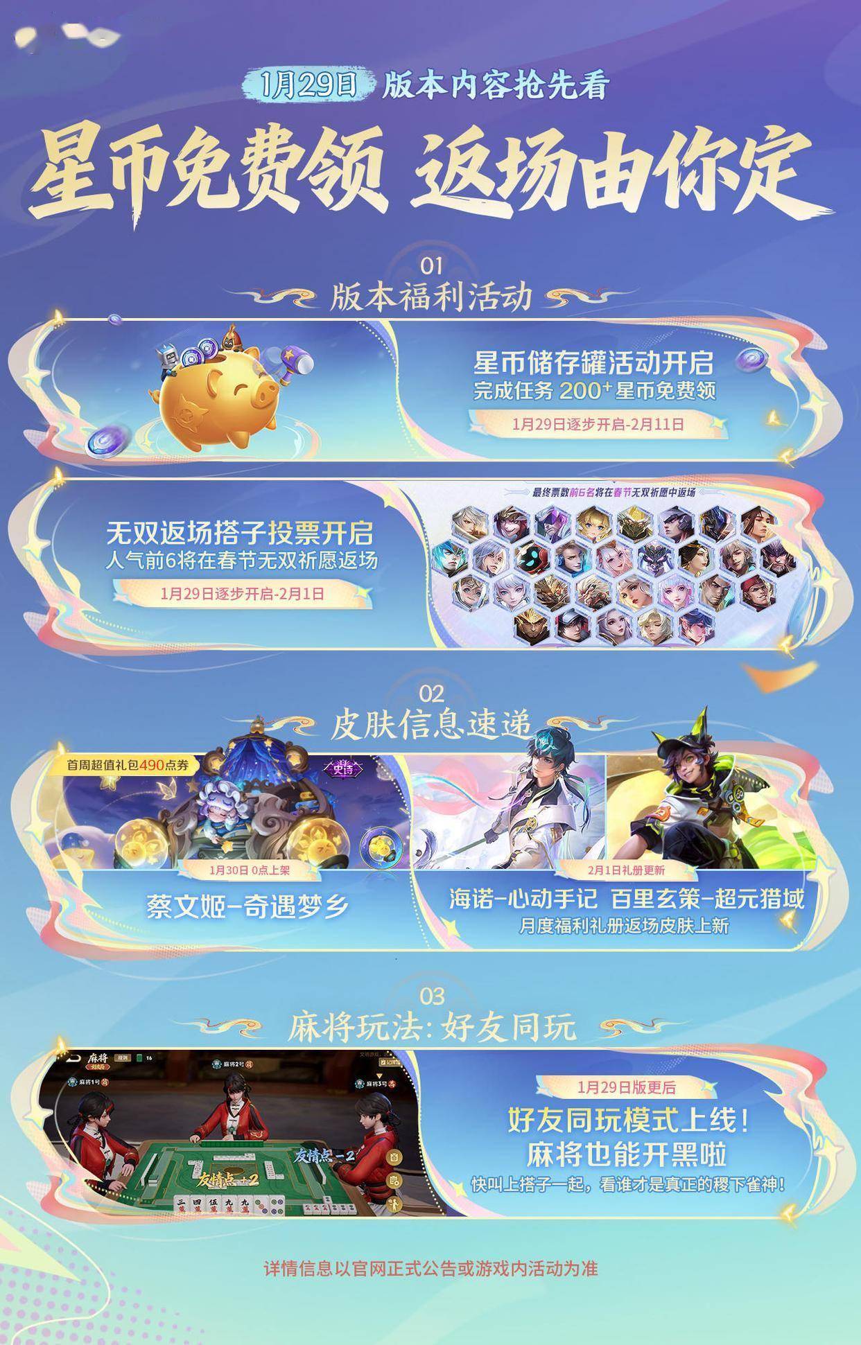 其余的更新大部分玩家可能并不关心,所以简单一提,星币储存罐活动开启,完成任务可以领取200星币的奖励。还有最近比较火热的麻将模式开启好友同玩模式,可以和自己的小伙伴一起来两局了。这项活动本身在现实中就是和小伙伴一起玩才快乐,现在游戏内也可以实现了,快叫上好友来隔空对弈吧~