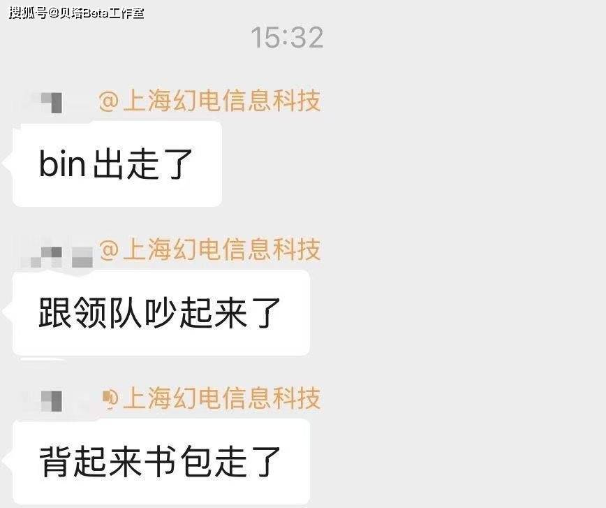 晒出的聊天记录如下图所示,有人透露:Bin离队出走,因为和领队吵起来了,直接背起书包就走了。其中幻电就是b站的运营公司,所以爆料来自内部人士。