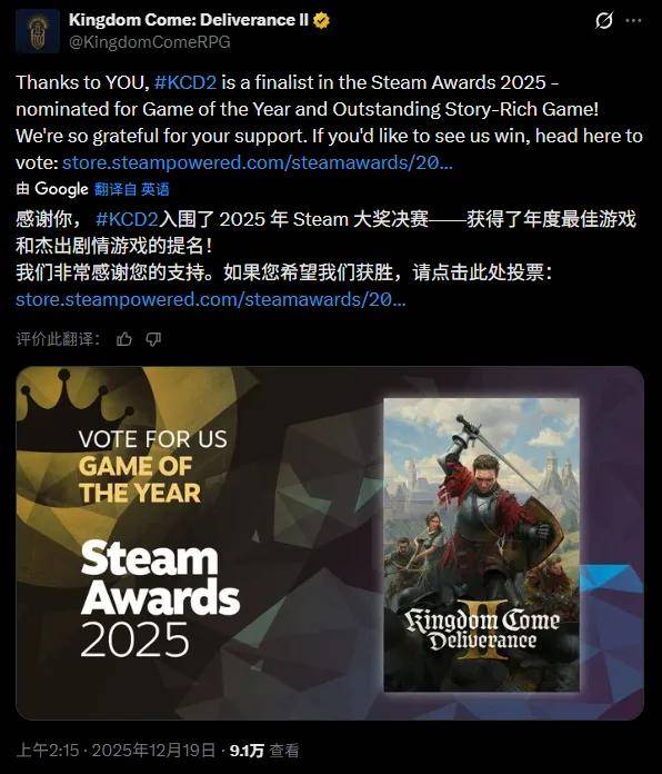 与此同时,另外一部被广泛看好的作品《天国:拯救2》却颗粒无收。TGA结束后,玩家群体出现许多声音,为这部作品感到不公。