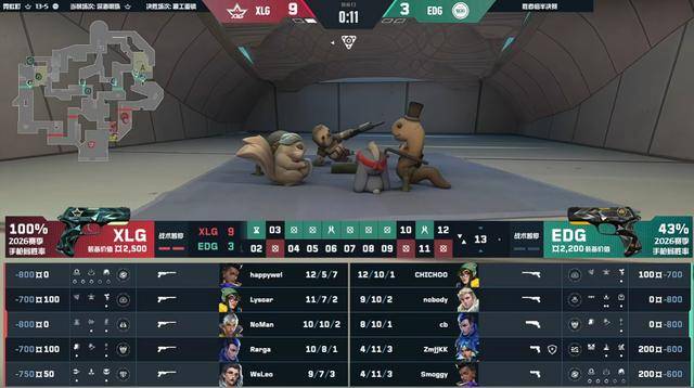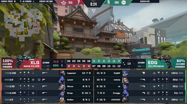 第12回合EDG快攻A点,nobody开大队友当探测箭,EDG一波提速快攻成功拿下。上半场EDG两个暂停全用,拿到三分,XLG拿到九分。