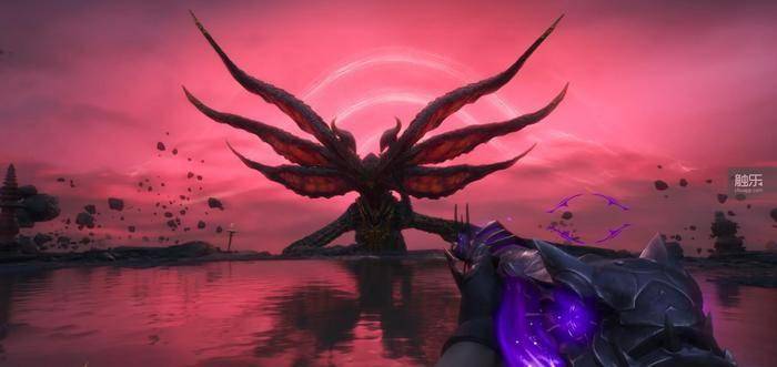 “昆仑神宫”的最终Boss是一只巨眼蛇身的怪物,诡异,又极具神秘感——第一阶段时,血条上的ID只是一串问号。蛇身在空中穿梭游龙,巨大又灵活,我想瞄准跟枪都变得十分困难。决战场地的水潭里会实时反射它的动作,远处的天光阴暗泛红,碎石在虚空中漂浮。