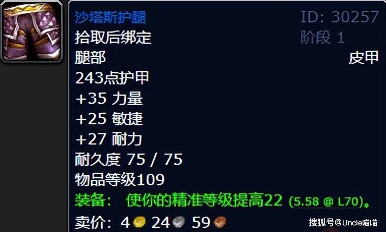 第二款给到的是任务“送往沙塔斯的特殊货物”奖励的沙塔斯护腿,这东西是最容易被近战物理职业给遗漏的极品精准腿了,特别是很多大兄弟做任务选择奖励的时候,满眼都是盯着哪几个金币看,高的直接选了扔商店,所以喵叔也是再次提醒各位大兄弟,在虚空风暴开启这个任务做到最后一环传送沙塔斯的时候,一定要眼睛看仔细了,尤其是狂暴战大兄弟,初期就是你补充竞争的最强皮甲装备了,喵叔100%推荐!