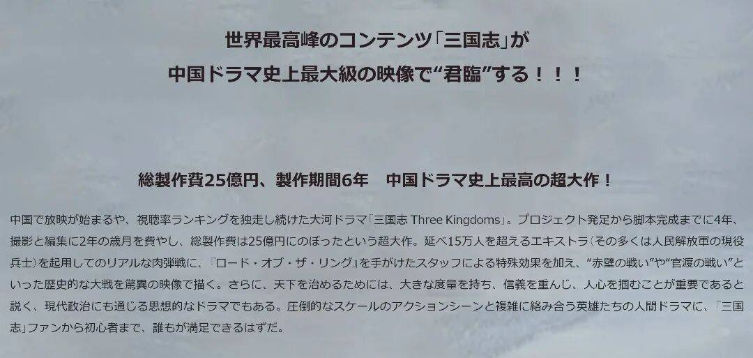 这当然是玩笑话。但新《三国》在日本的风评,确实比国内好上不少。新《三国》日本版权方之一的TVQ,在介绍这部作品的时候,特意用上了中二夸张的宣传口号:“中国电视剧史上最顶级的超级大作”。