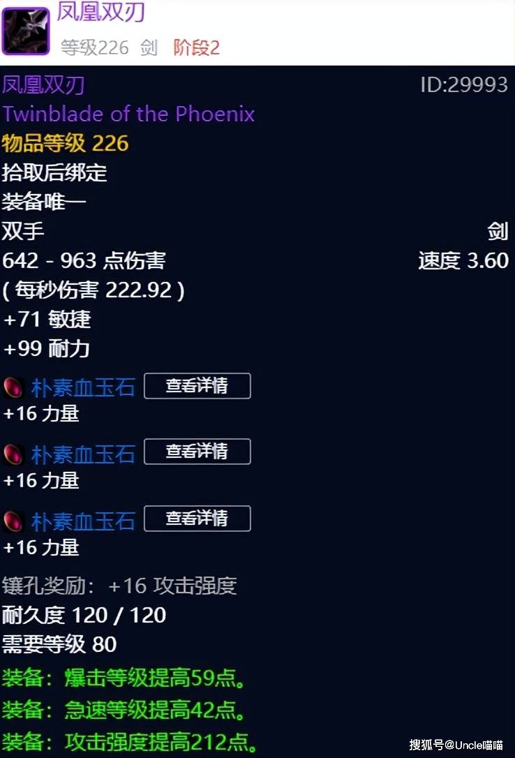 对于这款双手剑凤凰双刃的话,喵叔敢说竞争还是可以的,非锻造橙武的狂暴战以及惩戒骑可闭眼入,不喜欢双持的猎人大兄弟亦可闭眼入,有木有一种可能性,邪DK在没有好武器的时候也能拿着过渡,不夸张的说凤凰双刃还是非常圆润的一款武器,三个插槽,完美绿字,伤害也不低,3000金币遇上拿了肯定是不吃亏的,值得推荐!