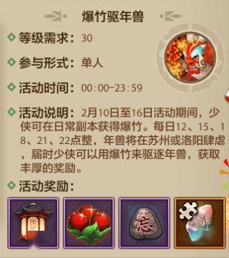 说到新年,咱们的老朋友年兽也是再次光临,2月10日至2月16日期间,各位少侠可使用从日常副本中获得的爆竹,前往苏州或洛阳阻止年兽的破坏,守护天龙居民的新春佳节,成功赶跑年兽还有小礼品可以领哦~