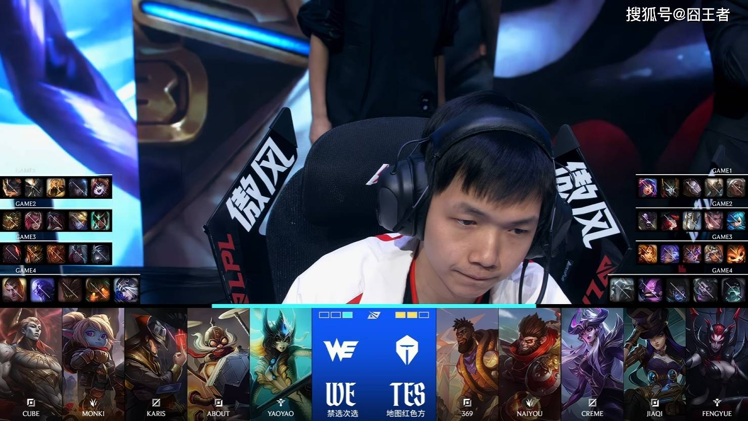 第四局比赛,WE蓝色方,禁用:杰斯,瑞兹,石头人,泰坦,寒冰,选用:Cube亚恒,Monki波比,Karis卡牌,About飞机,yaoyao娜美;TES红色方,禁用:掘墓,蒙多,塞拉斯,凯南,维克托,选用:369奎桑提,Naiyou猴子,Creme辛德拉,JiaQi女警,fengyue蜘蛛