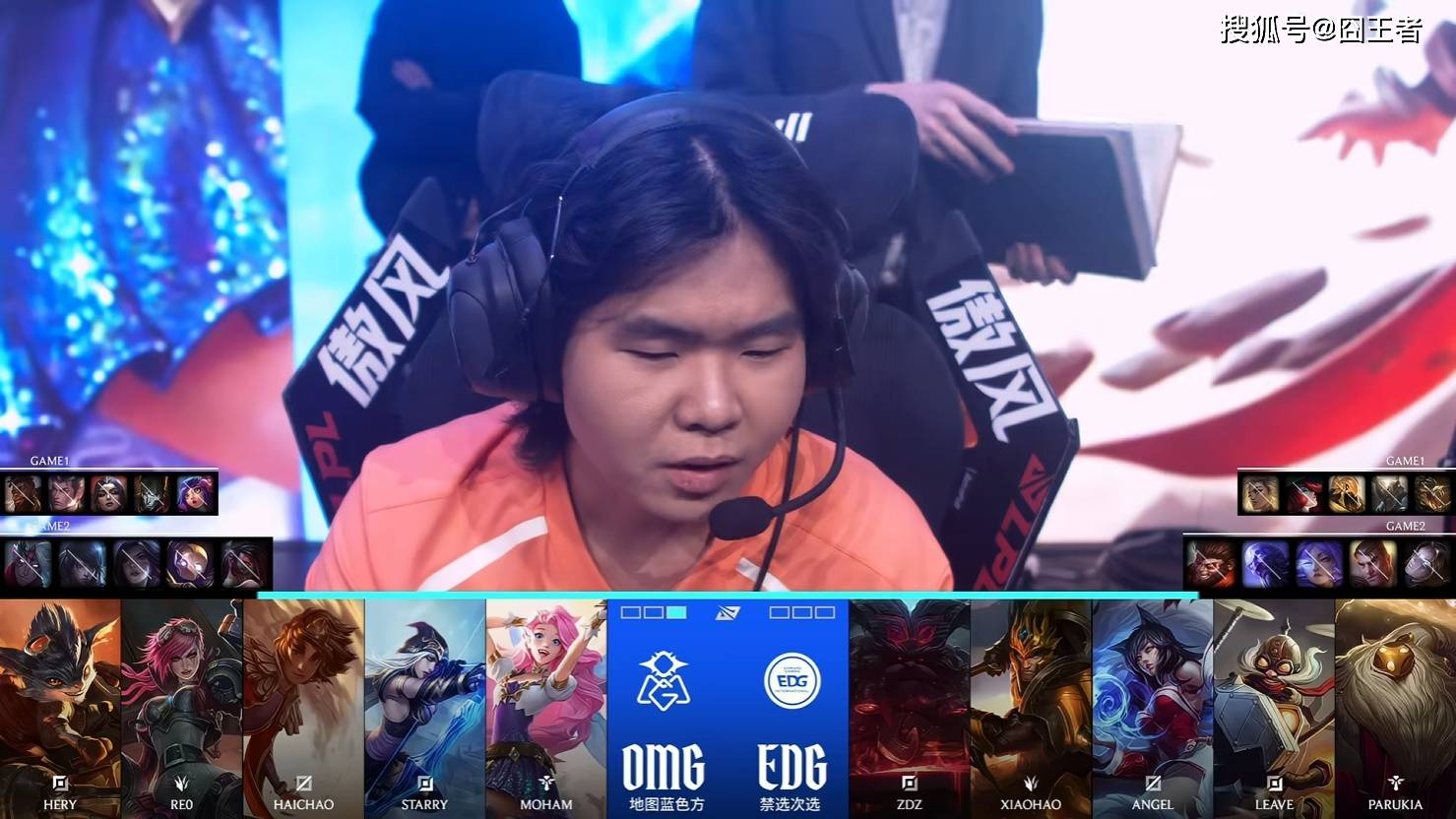 第二局比赛,OMG蓝色方,禁用:韦鲁斯,厄斐琉斯,卡莎,机器人,阿卡丽,选用:Hery兰博,Re0蔚,Haichao岩雀,Starry寒冰,Moham萨勒芬妮;EDG红色方,禁用:发条,杰斯,芸阿娜,瑞兹,猴子,选用:ZDZ奥恩,Xiaohao皇子,Angel阿狸,Leave飞机,Parukia巴德